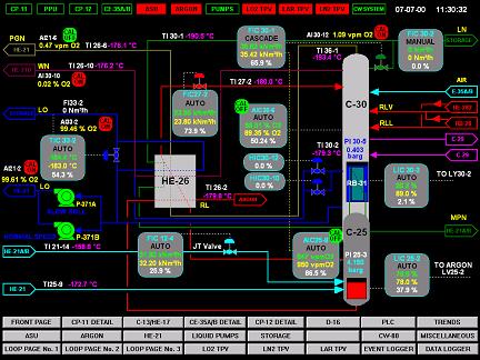 東部某大鋼鐵有限公司制氧廠的20000Nm3/h的空分設(shè)備采用了AX-2000系統(tǒng),從2005年7月投產(chǎn)至今,各項運行指標(biāo)正常。自動化設(shè)計及控制包括空壓機系統(tǒng)、空冷系統(tǒng)、水冷系統(tǒng)、分子篩純化系統(tǒng)、增壓膨脹機系統(tǒng)、精餾塔系統(tǒng)、加壓氣化系統(tǒng)、氧氣系統(tǒng)、氧壓機系統(tǒng)、調(diào)壓站系統(tǒng),整個空分系統(tǒng)全部由DCS系統(tǒng)控制,基本上實現(xiàn)了中央控制室的集中控制,自動控制系統(tǒng)運行穩(wěn)定、可靠,能滿足設(shè)計要求。