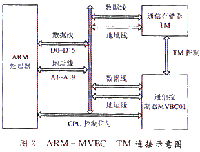 通信存儲(chǔ)器分別通過數(shù)據(jù)線,地址線和ARM處理器以及MVBC01相連,從而實(shí)現(xiàn)數(shù)據(jù)交換和地址尋址,ARM處理器、MVBC01和通信存儲(chǔ)器的連接示意圖如圖2所示。