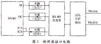物理層接口電路模塊的設(shè)計(jì)如圖3所示。物理層接口采用電氣短距離介質(zhì)ESD+接口,系統(tǒng)信號(hào)通道使用光耦實(shí)現(xiàn)主系統(tǒng)與外界得電隔離以提高系統(tǒng)可靠性,使用RS 485芯片作為收發(fā)器,并使用過壓保護(hù)模塊來防止瞬問過壓對(duì)器件的損壞。