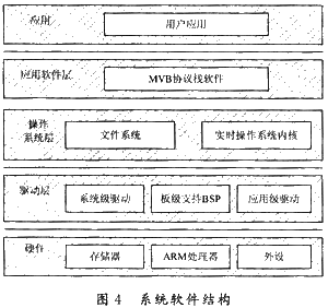 MVB 2類設(shè)備軟件體系采用典型的嵌入式軟件體系結(jié)構(gòu),包括驅(qū)動(dòng)層、操作系統(tǒng)層、應(yīng)用軟件層,其中操作系統(tǒng)層是軟件體系的核心。系統(tǒng)的軟件結(jié)構(gòu)如圖4所示。