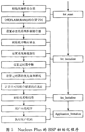 板級(jí)支持BSP 在用戶的應(yīng)用程序啟動(dòng)之前,完成對(duì)系統(tǒng)的初始化必須有專門的一段啟動(dòng)代碼,即板級(jí)支持BSP。板級(jí)支持BSP介于物理硬件和實(shí)時(shí)操作系統(tǒng)之間,在系統(tǒng)上電后,初始化系統(tǒng)的硬件環(huán)境,包括初始化ARM處理器、初始化中斷控制器、初始化存儲(chǔ)器、初始化堆棧等。NucleusPlus操作系統(tǒng)的BSP初始化程序流程如圖5所示。