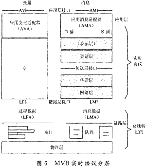 實(shí)時(shí)協(xié)議分層結(jié)構(gòu)如圖6所示。由圖中的分層結(jié)構(gòu)可知MVB實(shí)時(shí)協(xié)議包括過程變量通訊和消息數(shù)據(jù)通訊兩部分。由圖可知變量的協(xié)議和服務(wù)包括過程數(shù)據(jù)鏈路層接口(LPI)和變量的應(yīng)用層接口(AVI)。消息協(xié)議和服務(wù)包括消息數(shù)據(jù)鏈路層接口(LMI)、網(wǎng)絡(luò)層、傳送層、會(huì)話層、應(yīng)用層接口(AMI)。其中鏈路層接口又稱為低層接口,他規(guī)定來自總線的服務(wù),應(yīng)用層接口又稱為高層接口,他規(guī)定提供給應(yīng)用的應(yīng)用層接口。