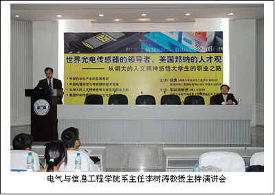 2007年10月11日晚,美國邦納工程國際有限公司大中國區(qū)總經(jīng)理胡勇先生在參加完美國邦納-湖南大學(xué)機器視覺與傳感器聯(lián)合實驗室揭牌儀式后,在湖南大學(xué)復(fù)臨舍報告廳內(nèi)對湖南大學(xué)的學(xué)生們進行一次主題為“在湖南大學(xué)的人文精神中感悟美國邦納的人才觀與大學(xué)生的職業(yè)之路”的演講。
