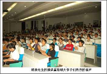 作為十多年前的湖大學(xué)子,胡勇先生以滿腔的激情及詼諧生動的言詞,傾述了他對湖大學(xué)子醇醇的殷切期望之情,現(xiàn)場氣氛熱烈,250人的大廳足足容納了300多人,演講持續(xù)了2個多小時,最后胡勇在回答了無數(shù)次最后一個問題后在學(xué)生們依依不舍的掌聲中結(jié)束了本次演講。