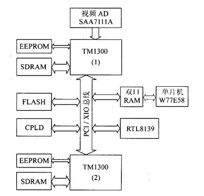 網(wǎng)絡(luò)視頻編碼器的硬件總體結(jié)構(gòu)如圖1 所示.編碼器將來(lái)自攝像頭的模擬視頻信號(hào)經(jīng)AD轉(zhuǎn)換芯片SAA7111A 轉(zhuǎn)換成YUV 格式的數(shù)字視頻信號(hào),由TM1300 (1) 按H.263 協(xié)議壓縮成多種速率的圖像數(shù)據(jù)碼流,然后通過(guò)PCI 總線傳遞給負(fù)責(zé)協(xié)議處理的TM1300 (2) ,視頻壓縮數(shù)據(jù)在這里封裝之后最后通過(guò)PCI 總線傳給以太網(wǎng)接口控制器RTL8139C(L) 為核心的以太網(wǎng)接口單元,由其送到IP 網(wǎng)上. 外圍擴(kuò)展模塊以W77E58 單片機(jī)為核心,通過(guò)兩個(gè)串口分別控制攝像頭和收發(fā)透明數(shù)據(jù). CPLD 主要完成地址譯碼、PCI 總線仲裁等功能. 開(kāi)發(fā)的應(yīng)用程序經(jīng)編譯連接,寫入FLASH 中.編碼器上電復(fù)位后通過(guò)EEPROM 中的自舉程序?qū)LASH 中的程序搬移到SDRAM 中,系統(tǒng)開(kāi)始運(yùn)行. 根據(jù)以上功能可以將網(wǎng)絡(luò)視頻編碼器的硬件設(shè)計(jì)分為以下四個(gè)功能單元: (1) 視頻編碼單元;(2) 協(xié)議處理單元; (3) 網(wǎng)絡(luò)接口單元; (4) 外圍擴(kuò)展單元.