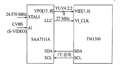 視頻編碼單元以TM1300 (1) 為核心,外圍器件包括EEPROM , 16M SDRAM , 視頻AD芯片SAA7111A ,雙口RAM 和16MB FLASH. 其中,SAA7111A 是Philips的增強(qiáng)型視頻輸入處理器( EVIP) , 輸入的模擬視頻信號(hào)可以是CVBS(PAL ,NTSC 等) 和S-Video ( Y/C) ,A/ D 轉(zhuǎn)換后輸出符合CCIR-656 的YUV4∶2∶2 數(shù)字視頻信號(hào).視頻輸入原理圖如圖2 所示,SAA7111A 的YUV數(shù)字視頻輸出端口和TM1300 的視頻輸入端口(VI) 相連接, SAA7111A 的工作方式由TM1300通過(guò)I2C 總線進(jìn)行配置.