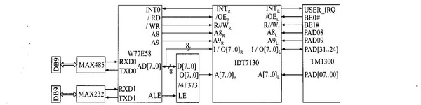 外圍擴(kuò)展單元原理圖如圖4 所示, 以WINBOND公司的具有兩個(gè)串口的單片機(jī)W77E58 為核心, 擴(kuò)展IDT7130 雙口RAM ,MAX232 和MAX485. W77E58 通過(guò)串口0 根據(jù)RS-485 接口標(biāo)準(zhǔn)實(shí)現(xiàn)對(duì)攝像頭及云臺(tái)的控制,通過(guò)串口1 傳送RS-232 透明數(shù)據(jù) . W77E58 和TM1300 (1) 之間通過(guò)自定簡(jiǎn)單協(xié)議對(duì)雙口RAM進(jìn)行存取,從而相互傳遞控制信息和數(shù)據(jù). 外圍擴(kuò)展單元的功能是通過(guò)對(duì)W77E58 編程來(lái)實(shí)現(xiàn)的,為了提高程序運(yùn)行的可靠性,在我們的單片機(jī)程序開(kāi)發(fā)中還使用了看門狗定時(shí)器.