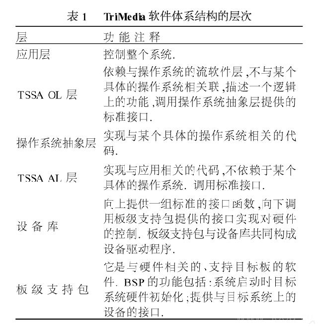 TSSA( TriMedia Software St ream Arc2hitecture) 是由應(yīng)用層模塊(Application) 與若干功能模塊(Component ) 組成的建立在數(shù)據(jù)包交換上的一種流結(jié)構(gòu). 沿用了COM 技術(shù)中軟組件對(duì)象(Software Component) 交互的思想,提出了對(duì)多媒體數(shù)據(jù)流進(jìn)行處理的一種組件對(duì)象模型 . 其中應(yīng)用層模塊負(fù)責(zé)系統(tǒng)的初始化, 采用軟件流體系結(jié)構(gòu)可以大大簡(jiǎn)化多媒體應(yīng)用開(kāi)發(fā). TSSA 體系分為以下幾層(見(jiàn)表1) :
