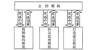 編碼器軟件組成結(jié)構(gòu)如圖5 示(不包括單片機(jī)編程部分) . 主控模塊相當(dāng)于TSSA 中的應(yīng)用層模塊,負(fù)責(zé)創(chuàng)建、運(yùn)行視頻編碼模塊、協(xié)議處理模塊和信道接口模塊,并通過(guò)響應(yīng)隊(duì)列與命令隊(duì)列在各功能模塊之間轉(zhuǎn)發(fā)控制與狀態(tài)消息. 視頻編碼模塊實(shí)現(xiàn)遵循H.263 協(xié)議的視頻壓縮編碼 ;協(xié)議處理模塊實(shí)現(xiàn)H.323 協(xié)議棧 ;信道接口模塊實(shí)現(xiàn)將數(shù)據(jù)報(bào)封裝成MAC 幀送上具體的物理信道. 各個(gè)功能模塊之間通過(guò)雙向消息隊(duì)列交換數(shù)據(jù).