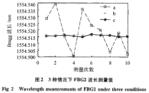 圖2中,a是用傳統(tǒng)的直接求峰值的方法,其標準差為0.042 41 nm ;b是在沒插值的情況下用相關(guān)譜法,其標準差為0 nm;c是采用插值-譜相關(guān)法(每相鄰點間線性插值8點),其標準差為0.002 14 nm。表面看上去,好像b最好,但它實際上是由于每相鄰點之間的間隔太大,以至于當(dāng)Bragg波長在最小的區(qū)間時,就不能清楚的分開它們,最終,將它們看作同一個值。先插入一定的數(shù)據(jù),提高分辨力后就使得原始光譜更加相似于漂移后的光譜,再運用相關(guān)譜法,就可以獲得最佳的效果。