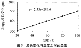 每次以10℃的步長逐步對FBG進行加溫,插值-相關(guān)譜法測得Bragg波長變化和溫度之間的關(guān)系如圖3。