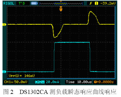 負(fù)載瞬變時(shí)間是一項(xiàng)動(dòng)態(tài)時(shí)間,它是負(fù)載電流瞬變后開(kāi)關(guān)電源的輸出電壓穩(wěn)定到預(yù)先規(guī)定穩(wěn)定帶內(nèi)的時(shí)間。測(cè)量信號(hào)的過(guò)程中,示波器必須有足夠的采樣率和波形捕獲率才能有效的捕獲到需要的波形。我們通常所測(cè)的響應(yīng)為μs或ms量級(jí),而RIGOL的DS1302CA可以測(cè)量最小1.2ns的上升時(shí)間,完全可以捕獲該瞬變信號(hào)。圖2反映了電流由0.1mA到65mA的過(guò)程中電壓瞬態(tài)變化情況。