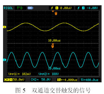 在開(kāi)關(guān)電源測(cè)試中經(jīng)常同時(shí)測(cè)量電路的輸入和輸出端,但輸入和輸出電壓的差距較大給操作帶來(lái)了一定難度。DS1302A的交替觸發(fā)能夠同時(shí)測(cè)量分析輸入和輸出兩個(gè)信號(hào),解決了操作上的難題。以往在中端示波器中,雙通道同時(shí)顯示時(shí)都是時(shí)基共用,而現(xiàn)在的產(chǎn)品就可用交替觸發(fā)來(lái)實(shí)現(xiàn)兩個(gè)通道各自有自己的時(shí)基,并且在各通道上可以選取不同的觸發(fā)方式。如圖5示,兩個(gè)不同的信號(hào),一個(gè)是Vpp=188V的信號(hào),另一個(gè)是Vpp=102mV的信號(hào),它們的頻率分別為50Hz和20kHz。