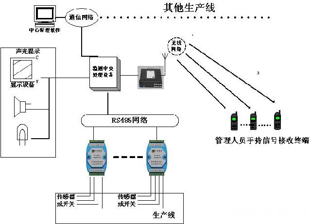 6、 系統(tǒng)和管理人員的通信方式,采用無線方式,管理人員可在廠區(qū)里任意活動,都能接收到信號,及時了解到當(dāng)前生產(chǎn)線的工作狀態(tài)。