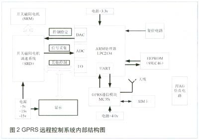 如圖2所示,遠程控制系統(tǒng)內(nèi)部結(jié)構(gòu)可分為系統(tǒng)電源、復(fù)位電路、信號采集、控制給定以及其他控制部分,這里著重介紹信號采集、GPRS遠程控制等部分。
