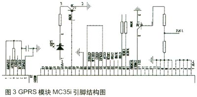 GPRS遠程控制系統(tǒng)是系統(tǒng)的核心部分,傳輸控制信息以及采集運行狀態(tài),是負責(zé)上位機控制系統(tǒng)和底層電機的聯(lián)系紐帶,核心部分由ARM7處理器LPC2134和GPRS無線通信模塊MC35i構(gòu)成。LPC2134與GPRS通信模塊MC35i的通信是通過串口通信來實現(xiàn)的,如圖3所示,通信模塊MC35i的16-23引腳數(shù)據(jù)輸入/輸出端標準串口的8個引腳分為DSR0、RING0、RXD0、TXD0、CTS0、RTS0、DTR0和DCD0,它有固定的參數(shù):8位數(shù)據(jù)位和1位停止位,無效驗位,波特率在300bps-115000bps之間,為了和開關(guān)磁阻電機調(diào)速系統(tǒng)正常地進行通信,這里選擇1200bps作為數(shù)據(jù)傳輸?shù)牟ㄌ芈?,硬件握手信號用RTS/CTS,模塊串口支持標準的AT命令集。
