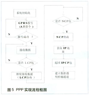 本設(shè)計環(huán)節(jié)需要支持GPRS功能的GSM模塊,使移動終端通過串口和GPRS模塊相連,然后通過AT命令先設(shè)置好模塊,定義PDP上下文和網(wǎng)絡(luò)服務(wù)質(zhì)量,發(fā)出進行申請GPRS服務(wù)的撥號命令,GPRS模塊的PPP協(xié)議服務(wù)器端程序進行協(xié)商投信,收到撥號命令后,GPRS模塊會進行網(wǎng)絡(luò)的附著,網(wǎng)絡(luò)分配無線鏈路資源,這時GPRS模塊中的PPP協(xié)議服務(wù)器端進入NETWORK狀態(tài),得到網(wǎng)絡(luò)分配的IP地址并通過IPCP協(xié)議分配給移動終端,這樣,移動終端就在串口和GPRS之間用PPP協(xié)議建立了一條透明的傳輸通道,并取得了自己的IP地址,可以和數(shù)據(jù)中心通信了,PPT實現(xiàn)流程見圖5。