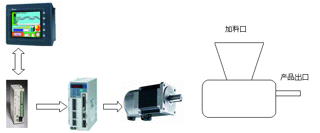 設(shè)備工作示意參見圖1。觸摸屏主要是用來顯示和控制、設(shè)定重量、采集數(shù)據(jù)顯示微調(diào)、記錄產(chǎn)量等;PLC主要是采集數(shù)據(jù)并計(jì)算,控制伺服電機(jī)和旋轉(zhuǎn)電機(jī)的動(dòng)作;伺服電機(jī)的作用是用來使旋轉(zhuǎn)送料器準(zhǔn)確定量。