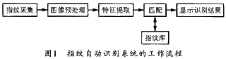 指紋識別是用取像設(shè)備讀取指紋圖像,并通過識別軟件提取指紋圖像中的特征數(shù)據(jù),然后根據(jù)匹配算法得到的結(jié)果來鑒別指紋所有人的身份,這種生物特征識別技術(shù)主要涉及指紋圖像采集、圖像預(yù)處理、特征提取、特征匹配等過程。識別時,可由計算機對預(yù)存的模板與當(dāng)前獲得的特征數(shù)據(jù)進行比較,以計算出它們的相似程度,從而得到兩幅指紋圖像的匹配結(jié)果。指紋自動識別系統(tǒng)(AFIS)的簡單流程如圖1所示。