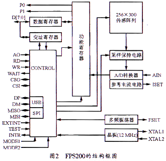 FPS200指紋傳感器由256×300個電容傳感陣列組成,其分辨率高達500 dpi,工作電壓范圍為3.3~5 V,傳感器內(nèi)部有8位ADC,并具有兩組采樣保持電路。FPS200的結(jié)構(gòu)框圖如圖2所示。