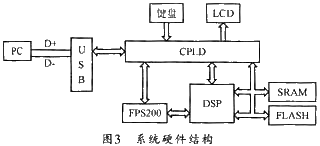 本指紋識別系統(tǒng)中的特征匹配和數(shù)據(jù)庫模塊可在主機上通過軟件實現(xiàn),指紋采集、圖像的預(yù)處理以及特征提取部分則可由DSP+CPLD完成。系統(tǒng)的硬件結(jié)構(gòu)如圖3所示。
