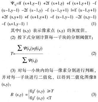 二值化處理是指整幅圖像處理成僅黑(灰度值為0)和白(灰度值為1)的過程。二值化的方法很多,關(guān)鍵在于閾值T的選取。采用以邊緣強度為權(quán)值的灰度平均法可直接得到分割閾值,其具體實現(xiàn)步驟如下: