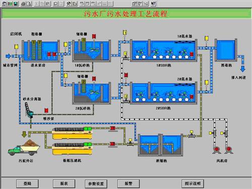 鼓風(fēng)機(jī),水泵,運(yùn)行閥的工作狀態(tài)可以通過(guò)動(dòng)畫(huà)實(shí)時(shí)顯示;污水,污泥,藥水,空氣的流動(dòng)方向及流量表的數(shù)據(jù)也能根據(jù)現(xiàn)場(chǎng)的情況隨時(shí)更新。操作人員在登陸并輸入用戶(hù)名和密碼后,可任意調(diào)入各局部工藝圖、運(yùn)行表、設(shè)定表和控制表,工藝圖以圖形的方式顯示各個(gè)工段的工藝流程和數(shù)據(jù),并能根據(jù)控制的需要直接設(shè)定現(xiàn)場(chǎng)的相應(yīng)參數(shù)(例如,泵站的變頻器的恒定水位,報(bào)警水位,停泵水位的設(shè)定,排泥時(shí)間的設(shè)定等)。此外,系統(tǒng)還可以提供故障報(bào)警查詢(xún),工作報(bào)表生成等功能。MCGS中的實(shí)時(shí)數(shù)據(jù)庫(kù)是監(jiān)控系統(tǒng)的核心,而數(shù)據(jù)變量是構(gòu)成實(shí)時(shí)數(shù)據(jù)庫(kù)的基本單元。將用戶(hù)界面中的圖形對(duì)象與實(shí)時(shí)數(shù)據(jù)庫(kù)中的數(shù)據(jù)變量建立聯(lián)系,現(xiàn)場(chǎng)的運(yùn)行情況就可以通過(guò)動(dòng)畫(huà)實(shí)時(shí)的顯示在監(jiān)控界面上了。