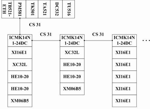 本系統(tǒng)共設(shè)8個(gè)分布I/O。從經(jīng)濟(jì)角度考慮,由于AC500系統(tǒng)可以兼容AC31的遠(yuǎn)程擴(kuò)展模塊,1#~8#分布I/O分別選用AC31系統(tǒng)的遠(yuǎn)程擴(kuò)展模塊(ICMK14N1-24DC)。分布I/O置于污水控制現(xiàn)場(chǎng),就近控制所屬設(shè)備,形成分布控制的能力,并采集現(xiàn)場(chǎng)設(shè)備的運(yùn)行狀況和故障信息,通過(guò)CS31總線聯(lián)接到PLC主站。CS31總線是一種點(diǎn)對(duì)多點(diǎn)的RS485串行通訊。每個(gè)通訊系統(tǒng)由一個(gè)主站和最大31個(gè)從站組成。通訊距離不加中繼為500米,加中繼最大可達(dá)到2000米。通訊介質(zhì)為:屏蔽雙絞線。