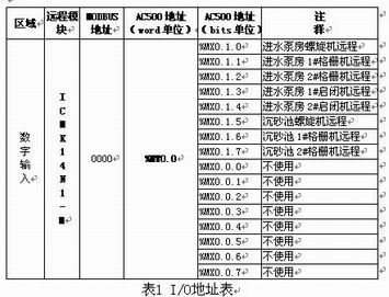 地址%MX0.0.0至%MX0.0.7是ICMK14N1-M的系統(tǒng)保留區(qū)域,不能使用。地址%MX0.1.0至%MX0.1.7作為此遠(yuǎn)程擴(kuò)展模塊自帶的開(kāi)關(guān)量輸入,分別對(duì)應(yīng)進(jìn)水泵房及沉砂池的相應(yīng)設(shè)備。依照同樣的方法,可以繼續(xù)定義1#分布I/O的(XI16E1,XC32L,HE10-20,…等)開(kāi)關(guān)量及模擬量輸入/輸出模塊,然后依次是2?!?#分布I/O的所有模塊。