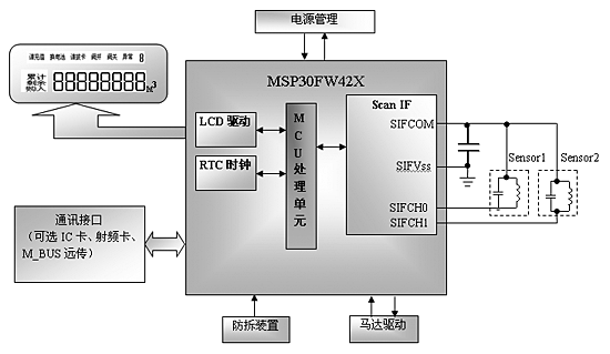 使用MSP430FW42X開發(fā)的水表、熱量表,系統(tǒng)直接采用內部流量掃描模塊(Scan IF)不需要外部流量檢測IC ,直接取代TMS3723B ,大大簡化了系統(tǒng)硬件設計和軟件設計,并且提高了系統(tǒng)的穩(wěn)定性。使用 MSP430FW42X 開發(fā)的無磁水表系統(tǒng)框圖如下: