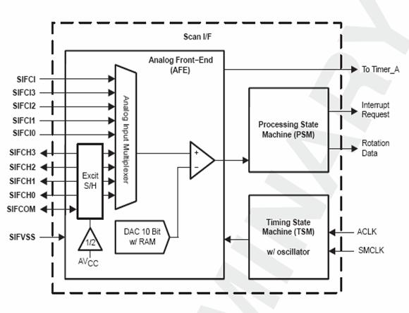 SCAN IF模塊能夠在低功耗下自動檢測線性或旋轉的運動。 SCAN IF模塊由三部分組成:模擬前端(AFE) 、信號處理狀態(tài)機(PSM) 、定時狀態(tài)機(TSM) 。其中模擬前端的主要元器件是一個“VCC/ 2” 發(fā)生器,一個比較器和一個10位DAC 。模擬前端用來激勵傳感器,檢測信號電平并把信號轉換為數字形式;這些數字信號進入信號處理狀態(tài)機,信號處理狀態(tài)機 計算出轉動(流體流量)和它的方向 ;定時狀態(tài)機用來控制模擬前端和信號處理狀態(tài)機。
