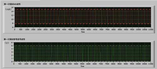顯示畫面可以在“查看數(shù)據(jù)”、“第一次波形”、“第二次波形”和“參數(shù)設(shè)置及硬件測(cè)試”四個(gè)界面間切換。默認(rèn)畫面是“查看數(shù)據(jù)”,也是主界面,如圖7所示。在默認(rèn)畫面上顯示出要求測(cè)試項(xiàng)目的計(jì)算值、測(cè)試結(jié)果和此次程序運(yùn)行后測(cè)試的數(shù)量、合格的數(shù)量及合格率。在測(cè)試過程中,有測(cè)試進(jìn)程顯示。在“第一次波形”和“第二次波形”畫面中顯示出兩次連續(xù)測(cè)試的ABS信號(hào)和REF信號(hào)波形。圖8是第一次測(cè)試波形。在“參數(shù)設(shè)置及硬件測(cè)試”畫面中,授權(quán)用戶能進(jìn)行參數(shù)設(shè)置。需要對(duì)系統(tǒng)進(jìn)行調(diào)試時(shí),能進(jìn)行硬件測(cè)試。每天以日期為文件的前綴生成數(shù)據(jù)記錄文件,如“2006-6-3_ABS”。