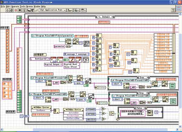 實(shí)踐證明,LabVIEW 7.1的圖形化編程,易于閱讀和理解,軟件中豐富的例程對(duì)初學(xué)者極為有用,實(shí)用的裝飾件可以做出美觀實(shí)用的界面。圖9是LabVIEW塊圖程序。目前,這一ABS功能測(cè)試系統(tǒng)已經(jīng)交付使用,該系統(tǒng)技術(shù)可靠、運(yùn)行穩(wěn)定、能夠保證測(cè)量精度。相對(duì)進(jìn)口的同類設(shè)備,雖然采集卡采樣速率都是250kS/s,但是進(jìn)口設(shè)備的A/D轉(zhuǎn)換分辨率是12位,而NI PCI-6220的轉(zhuǎn)換分辨率是16位,此外,進(jìn)口設(shè)備的價(jià)格是本系統(tǒng)的3、4倍,這一系統(tǒng)的成功也給用戶節(jié)省了設(shè)備投資。