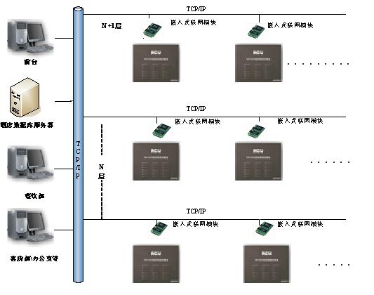 2、通訊系統(tǒng)(客房、樓層、中心三級(jí)通訊,通過(guò)RS485總線或TCP/IP以太網(wǎng)構(gòu)成);