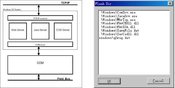 對于型號PKV40-PB來說,其內(nèi)部嵌入了赫優(yōu)訊的通訊模塊COM-PB,因此它是一個Profibus主站;同時嵌入式主板上提供了一個以太網(wǎng)通訊口,因此它也可以實現(xiàn)以太網(wǎng)通訊,所有通訊功能的實現(xiàn)由內(nèi)部FLASH中的EXE程序來執(zhí)行,下面是PKV的內(nèi)部軟件結(jié)構(gòu)圖和內(nèi)部FLASH程序: