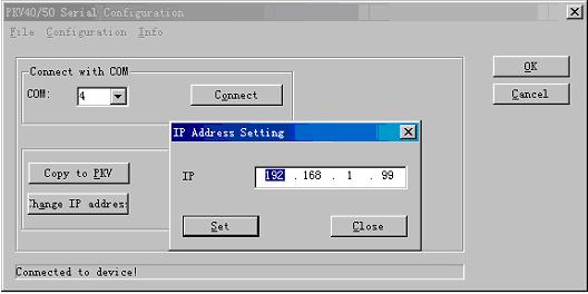 選擇Tools菜單->PKV40-PB->PKV40SerialConfiguration,在彈出的對話框中選擇相應(yīng)的串口,然后點擊Connect按鈕連接到PKV,然后選擇Configuration菜單中的相關(guān)菜單設(shè)置PKV的IP地址和子網(wǎng)掩碼,如下圖所示: