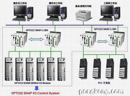 在本系統(tǒng)中,采用OPTO 22的先進(jìn)且成熟可靠的OPTO22 SNAP I/O系統(tǒng),這是一個應(yīng)用串行通訊多次重發(fā)技術(shù)的三層分布式網(wǎng)絡(luò)。本系統(tǒng)由自控中心的監(jiān)控主機(jī)PC和四臺OPTO 22的主控制器OPTO22 SNAP-LCM4以及7個可分布安裝放置的前端智能I/O單元B3000組成,有關(guān)的系統(tǒng)結(jié)構(gòu)示意圖,請參閱以下的圖示?!?/P>
