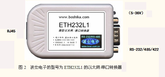 第二代以太網(wǎng)工業(yè)通信產(chǎn)品可以從以太網(wǎng)口直接擴(kuò)展出RS-232、RS-485、RS-422口。波仕電子以太網(wǎng)/串口轉(zhuǎn)換器(型號(hào):ETH232L1)用于將一個(gè)以太網(wǎng)口轉(zhuǎn)換成為RS-232、RS-485(半雙工)或者RS-422口(全雙工),如圖2。波仕ETH232L1微型以太網(wǎng)/串口轉(zhuǎn)換器具有超小型的專(zhuān)利外形(80*23*47mm)、RS-232、RS-485、RS-422通用(配有接線端子),可以虛擬成為本地COM串口(COM1-COM256)、無(wú)須修改已有的串口通信軟件。同時(shí)波仕贈(zèng)送具有自主知識(shí)產(chǎn)權(quán)的通信源程序(VC++,VB、BC可以嵌入用戶通信程序)以及擁有版權(quán)的以太網(wǎng)-串口影射程序。