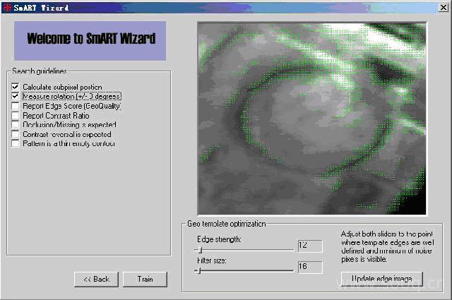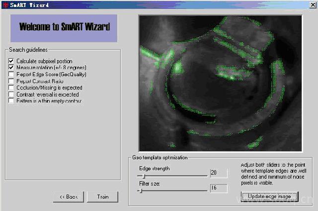 由于待檢測工件在生產(chǎn)流水線傳輸過程中不可避免位置會發(fā)生偏移動,因此在檢測時我們必須在軟件中對所拍圖像進(jìn)行自動定位。我們選取工件中兩點(diǎn)作為定位點(diǎn),下圖是對第一個定位點(diǎn)進(jìn)行培訓(xùn)學(xué)習(xí):