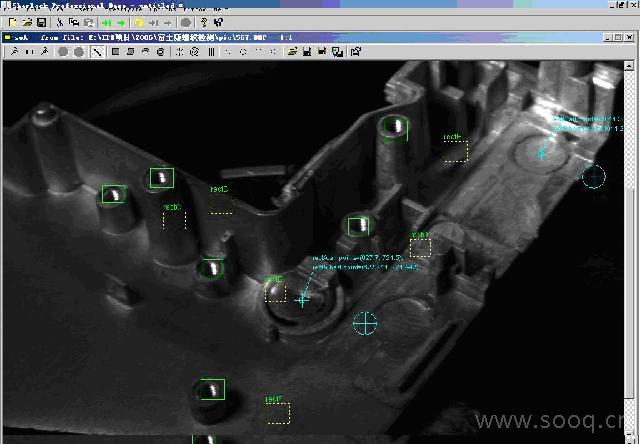 黃色虛線方框?yàn)橐苿忧暗臋z測位置,當(dāng)工件移動后,檢測區(qū)域會精確的自動移動到相應(yīng)的螺紋孔上方。