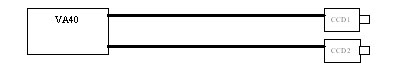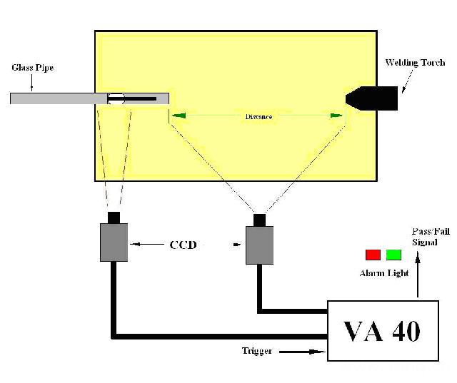 用1臺VA40和2臺相機來檢測玻璃管焊接點與焊槍之間的距離以及玻璃管自身內部是否有異物。如下圖所示意: