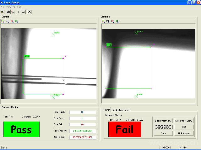 4.視覺系統(tǒng)對兩臺相機所拍攝的圖像進行處理分析,將玻璃管焊點與焊槍頭之間的測量距離傳送給PLC,如發(fā)現(xiàn)玻璃管中有雜質,視覺系統(tǒng)將會發(fā)出報警信號給外部設備。