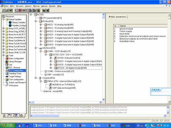 系統(tǒng)控制軟件由主程序和多個子程序模塊組成的,它是以ABB Codesys v2.3編程軟件為開發(fā)環(huán)境,Codesys v2.3這套編程軟件符合IEC61131-3的國際標準,可支持IL、LD、FBD、SFC、ST五種不同的編程語言??赏瓿葾C500系統(tǒng)的全部設置,包括所有的總線接口,而且還有全面的自診斷功能、報警處理、可視化調試工具和開放的數據接口。另外還可在沒有連接PLC硬件的情況下進行仿真,對用戶程式進行調試,包括相關的手動功能。調試后的程式再下載到CPU 控制系統(tǒng)中使用。