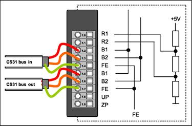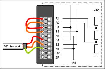 在CS31總線中間的CS31總線模塊(不需要激活終端電阻)接線如圖3所示: