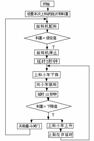 本文中采用的是梯形圖方式編程。本系統(tǒng)的控制分主控室集中和機旁兩種工作方式,在主控室的操作界面中,又分為手動和自動方式。整個控制程序是用ABB Codesys v2.3實現的,大致分為如下幾部分:小車上料、配料、稱重、布料、出灰、風量控制、電機電流、溫度、壓力、流量等模擬量的顯示報警,其中配料稱重和上料控制是本系統(tǒng)的控制難點,在編程中需要考慮的因素較多,并利用一些技巧,如稱重時的偏差及偏差的修正,石灰石給料機的工備切換,石灰石給料、焦炭給料的連鎖,給料量的設定、累計,上料與配料的連鎖,各種故障及誤操作的處理等,圖5為配料、上料部分在自動工作方式下的主流程圖。