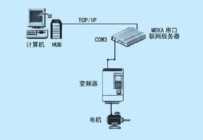 采用串口上網(wǎng)技術,實際上使變頻器具有IP地址,并通過MOXA 串口服務器接入網(wǎng)絡,使網(wǎng)絡中的計算機可以對其遠程監(jiān)控。