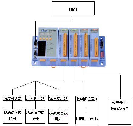 上位機使用了一臺HMI,來運行組態(tài)王的組態(tài)軟件,然后通過串口通訊與I-8431實現(xiàn)數(shù)據(jù)交換。I-8431上插有3個模塊: