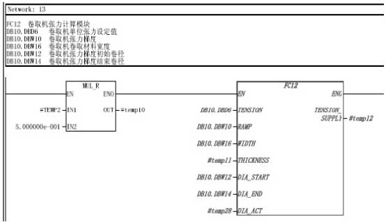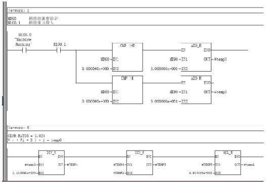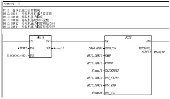 以上列出部分速度、轉(zhuǎn)矩的梯形圖,其他的如動(dòng)態(tài)補(bǔ)償模塊、靜態(tài)補(bǔ)償模塊限于篇幅、技術(shù)等因素,不在列出,將速度、轉(zhuǎn)矩給定值轉(zhuǎn)化為傳動(dòng)模塊規(guī)定的量剛值,并由PLC傳輸給傳動(dòng)模塊進(jìn)行控制。