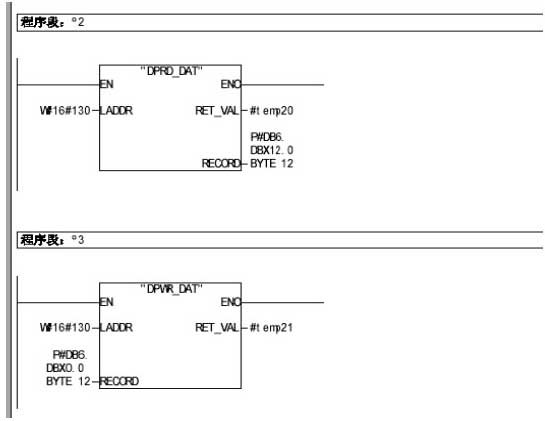 通過Drive ES Basic V5.1軟件對(duì)變頻器進(jìn)行參數(shù)設(shè)置, 在周期性的通訊中,Profibus-DP使用PPO(對(duì)象過程類)類型作為數(shù)據(jù)傳遞的格式。它有5種PPO類型,根據(jù)信息量大小選擇PPO類型,其報(bào)文中有用數(shù)據(jù)為PKW和PZD,PKW為參數(shù)識(shí)別值區(qū),最多4個(gè)字,主要是讀寫參數(shù) ,PZD為過程數(shù)據(jù)區(qū),最多10個(gè)字,如:電流、速度的設(shè)定和反饋值等,主要是設(shè)定值和狀態(tài)值。本條線采用的是PPO2類型,使參數(shù)P060=2,并存儲(chǔ)在EEPROM中,參數(shù)便恢復(fù)到缺省值(工廠設(shè)定值),此后便可根據(jù)現(xiàn)場和工藝要求設(shè)定各裝置參數(shù)。主要參數(shù)為P100控制模式, P101電機(jī)額定電壓,P102電動(dòng)機(jī)的額定電流,P107電動(dòng)機(jī)的額定頻率Hz,P108電動(dòng)機(jī)的額定速度,以及各種工藝參數(shù)的選擇設(shè)置等,參數(shù)P734與數(shù)據(jù)塊DB建立數(shù)據(jù)連接,P918變頻器地址等設(shè)定,然后下載到相應(yīng)變頻器,這樣PLC就可以與變頻器建立通訊鏈接,本例是在STEP7中的OB1組織塊中調(diào)用SFC14“DPRD_DAT”、SFC15“DPWR_DAT”系統(tǒng)功能塊同變頻器進(jìn)行讀、寫數(shù)據(jù)交換,梯形圖如下。