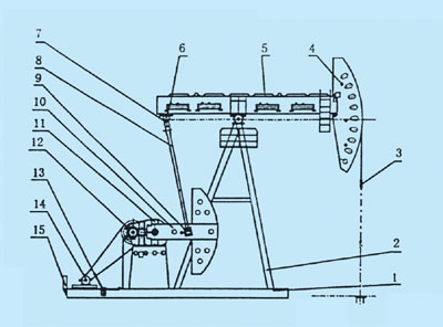 常規(guī)曲柄平衡抽油機結(jié)構(gòu)示意圖如圖1所示,圖1中,1-底座;2-支架;3-懸繩器;4-驢頭;5-游梁;6-橫梁軸承座;7-橫梁;8-連桿;9-曲柄銷裝置;10-曲柄裝置;11-減速器;12-剎車保險裝置;13-剎車裝置;14-電動機;15-配電箱。游梁式抽油機是一種變形的四連桿機構(gòu),其整機結(jié)構(gòu)特點像一架天平,一端是抽油載荷,另一端是平衡配重載荷。對于支架來說,如果抽油載荷和平衡載荷形成的扭矩相等或變化一致,那么用很小的動力就可以使抽油機連續(xù)不間斷地工作。也就是說抽油機的節(jié)能技術(shù)取決于平衡的好壞。在平衡率為100%時電動機提供的動力僅用于提起1/2液柱重量和克服摩擦力等,平衡率越低,則需要電動機提供的動力越大。因為抽油載荷是每時每刻都在變化的,而平衡配重不可能和抽油載荷作完全一致的變化,才使得游梁式抽油機的節(jié)能技術(shù)變得十分復雜。因此可以說:游梁式抽油機的節(jié)能技術(shù)就是平衡技術(shù)。
